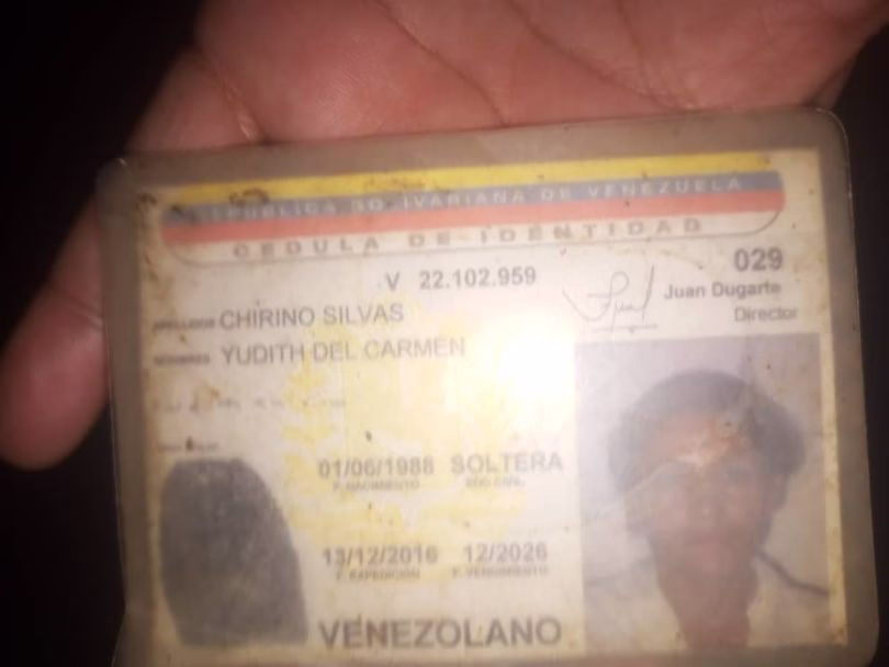 Las autoridades encontraron entre sus pertenencias una cédula de identidad y un carnet de la patria a nombre de Yudith del Carmen Chirino Silva, de 37 años de edad.